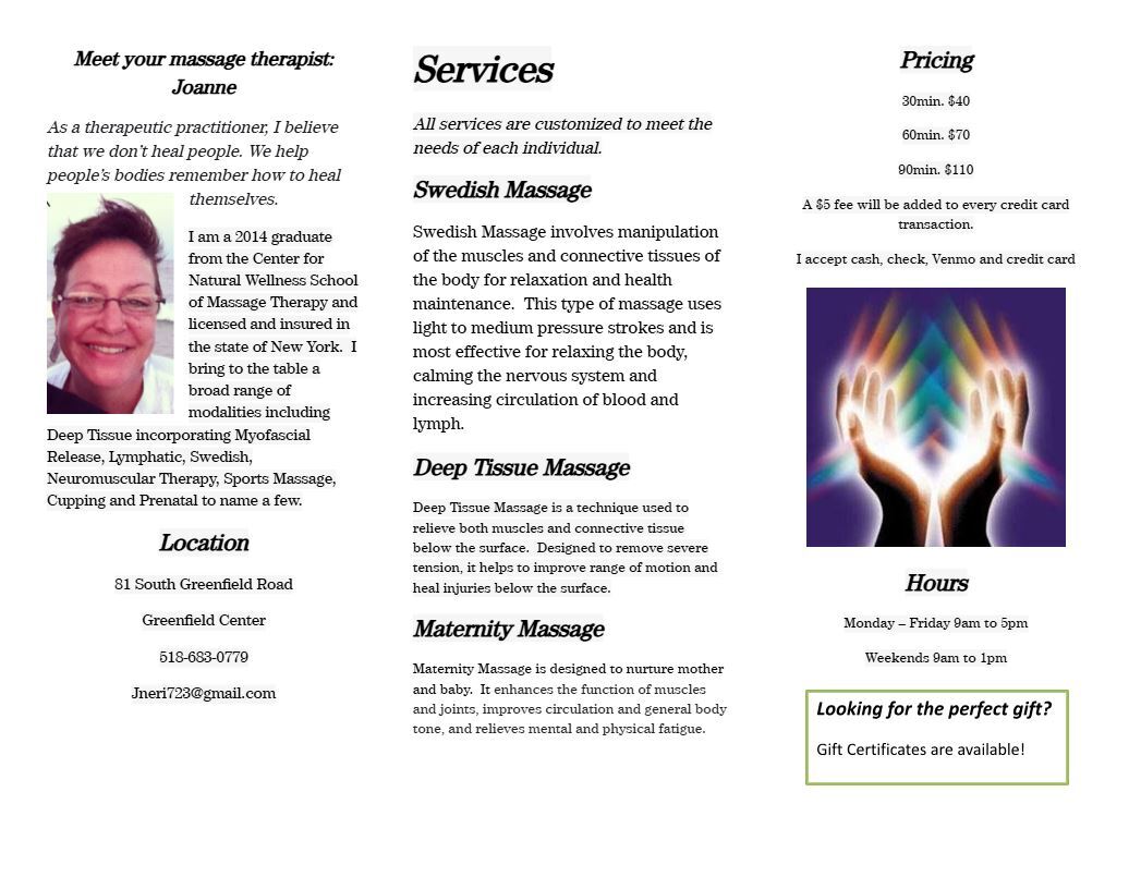 We offer licensed, caring massage therapists at Rotterdam. Rotterdam you'll meet Gail Hammond LMT and Hellen Wager. Let them help you massage your cares away!